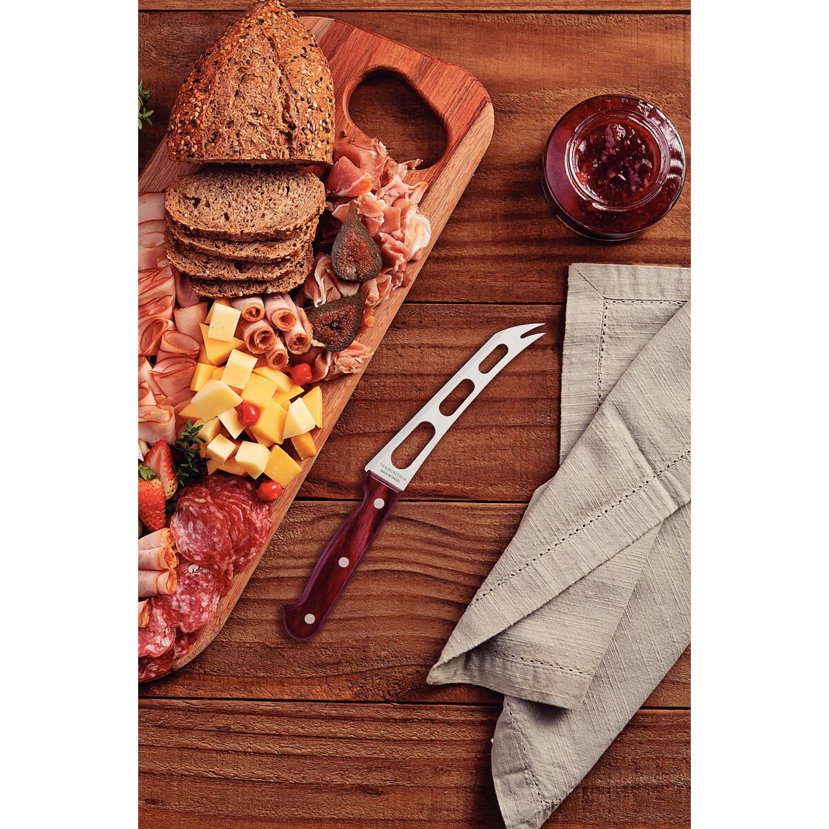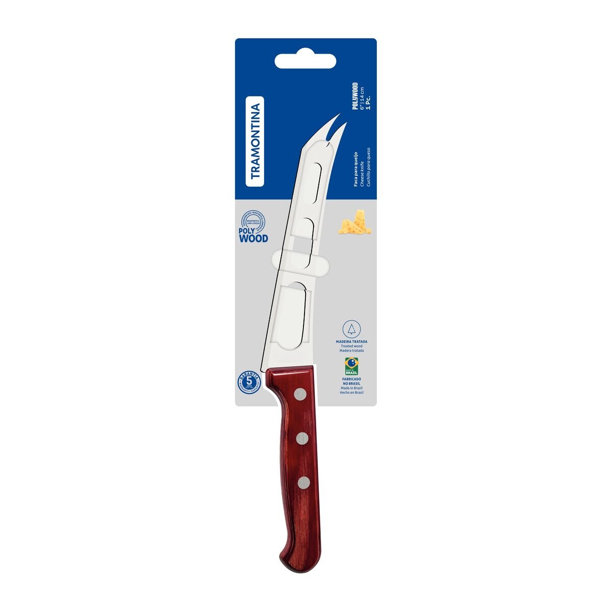 سكين جبن ترامونتينا بوليوود مقاس 6 بوصات بشفرة من الفولاذ المقاوم للصدأ ومقبض من الخشب المعالج باللون الأحمر