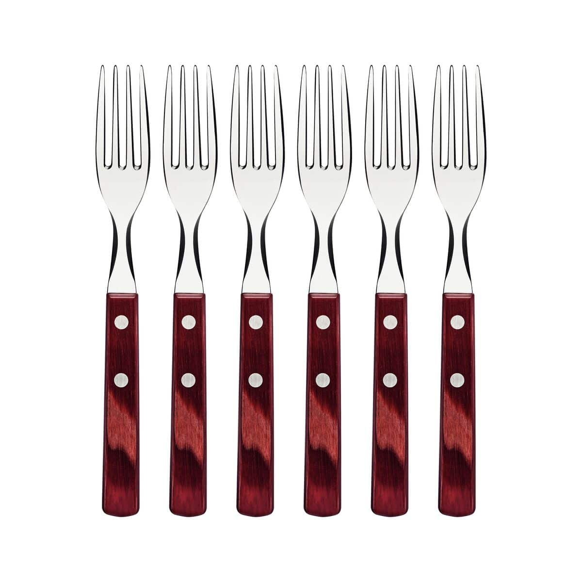 مع طقم شوك ترامونتينا للمائدة المكون من 6 قطع، بأسنان من الفولاذ المقاوم للصدأ ومقبض خشبي أحمر معالج ببولي وود، سيصبح عشاءك أو غداءك أكثر لذة. مصنوع من أسنان من الفولاذ المقاوم للصدأ ومقابض خشبية معالجة ببولي وود، يوفر لك هذا الطقم كل ما تحتاجه: متانة عالية، قوة، وجمال. احصل على طقمك الخاص وحوّل لحظاتك على المائدة إلى تجربة مميزة!
