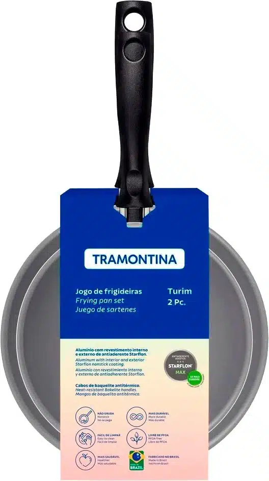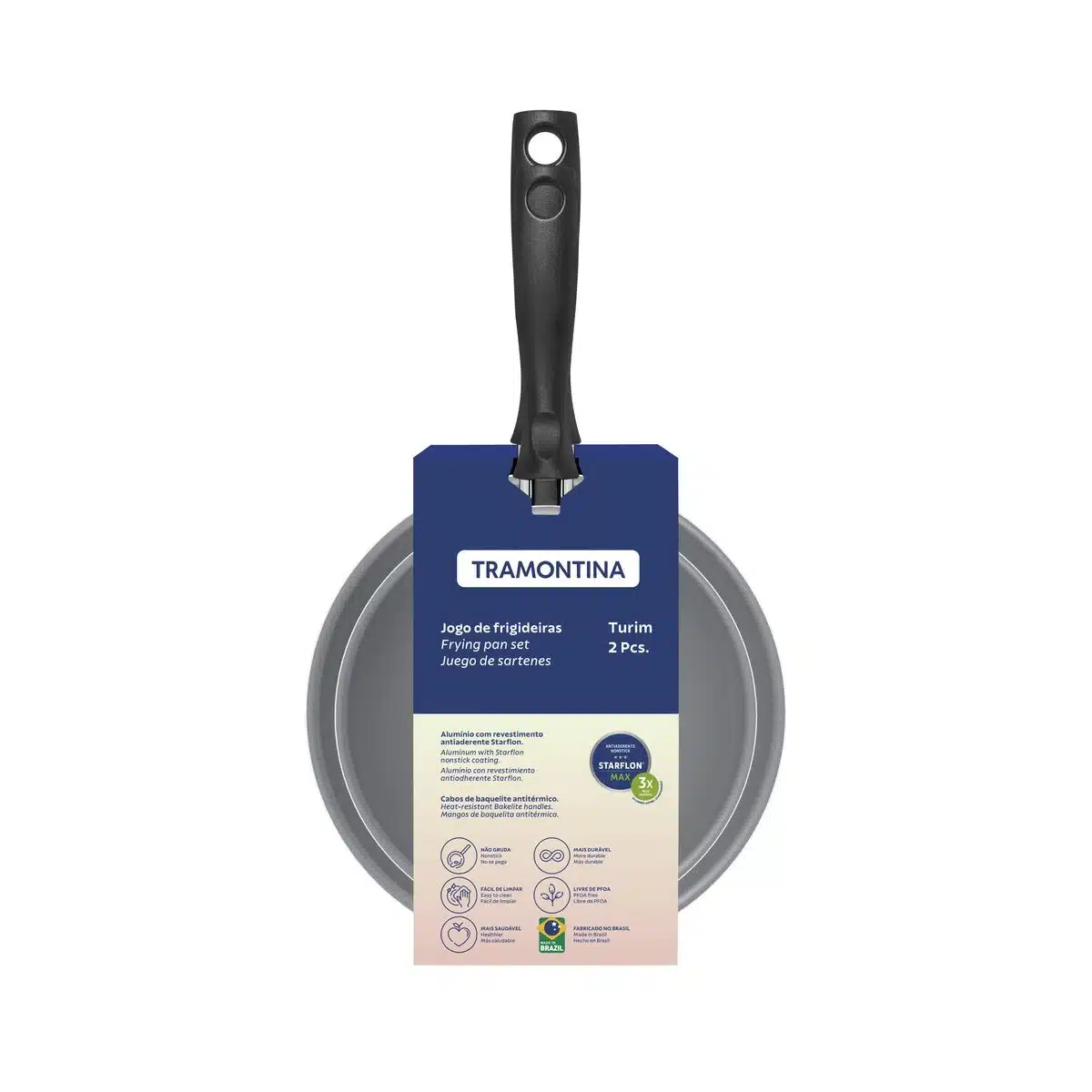 طقم مقلاة ترامونتينا توريم المكون من قطعتين بقياس 16 و 20 سم من الألومنيوم مع طلاء ستارفلون ماكس الداخلي والخارجي غير اللاصق بلون الرصاص لا غنى عنه لأولئك الذين يسعون إلى التنوع والعملية في المطبخ. العناصر الموجودة في المجموعة مصنوعة من الألومنيوم بسمك يعزز الطهي السريع والمتساوي. طلائها الداخلي والخارجي غير اللاصق ستارفلون ماكس، وهي ميزة تمنع الطعام من الالتصاق بسطحها وتجعل تنظيفها أسهل ولا تضر بالصحة. المقابض مصنوعة من الباكليت المقاوم للحرارة، وهي مادة لا تسخن وتعزز التعامل الآمن والمريح. كما أن المقالي آمنة للغسل في غسالة الأطباق وستضمن لك سهولة وعملية أكبر ليومك!