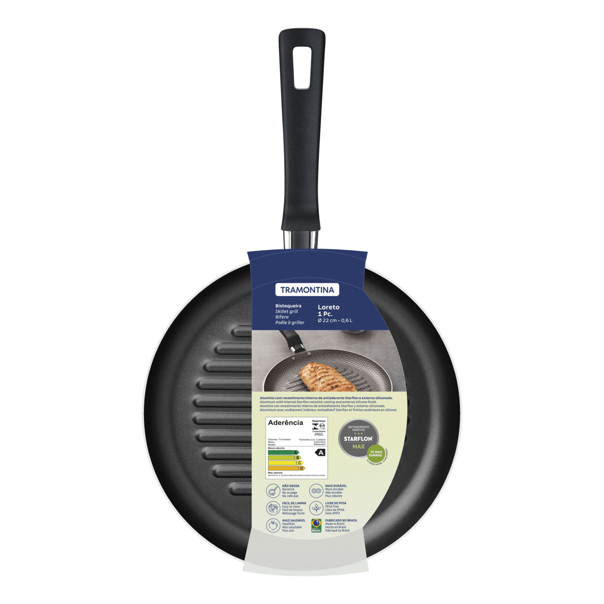 مقلاة شواء 22 سم لون اسود داخل غير قالب للالتصاق كون تحتوي على مادة ستار فلون ماكس وخالي من حمض البيرفلوروكتان المضر بالصحة مقبض بولي بروبيلين مقاوم للحرارة