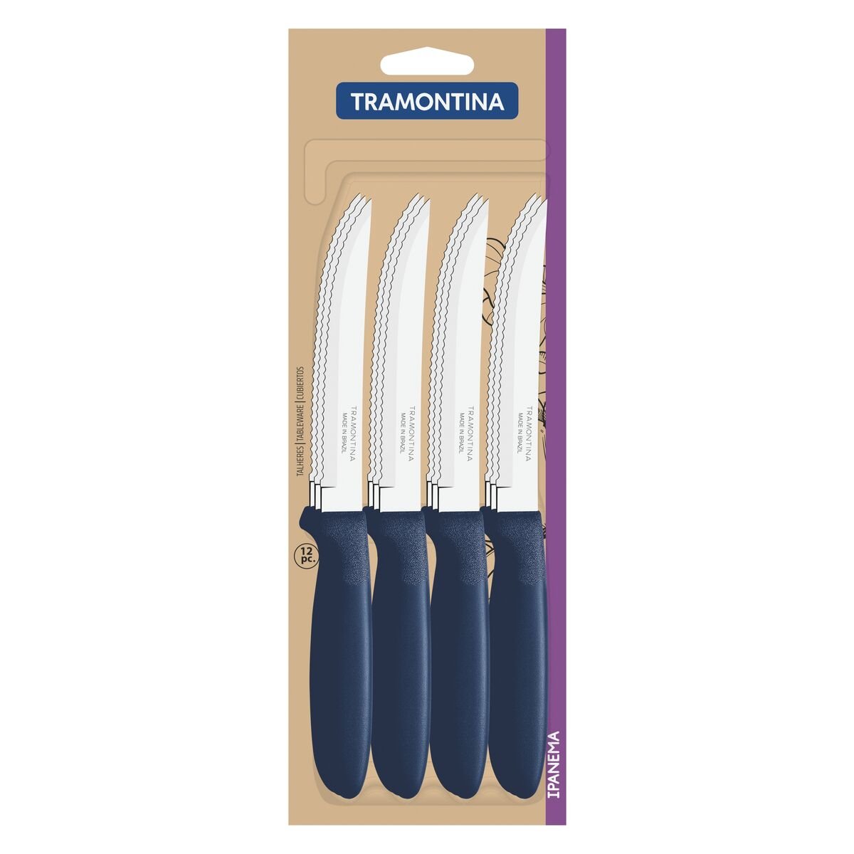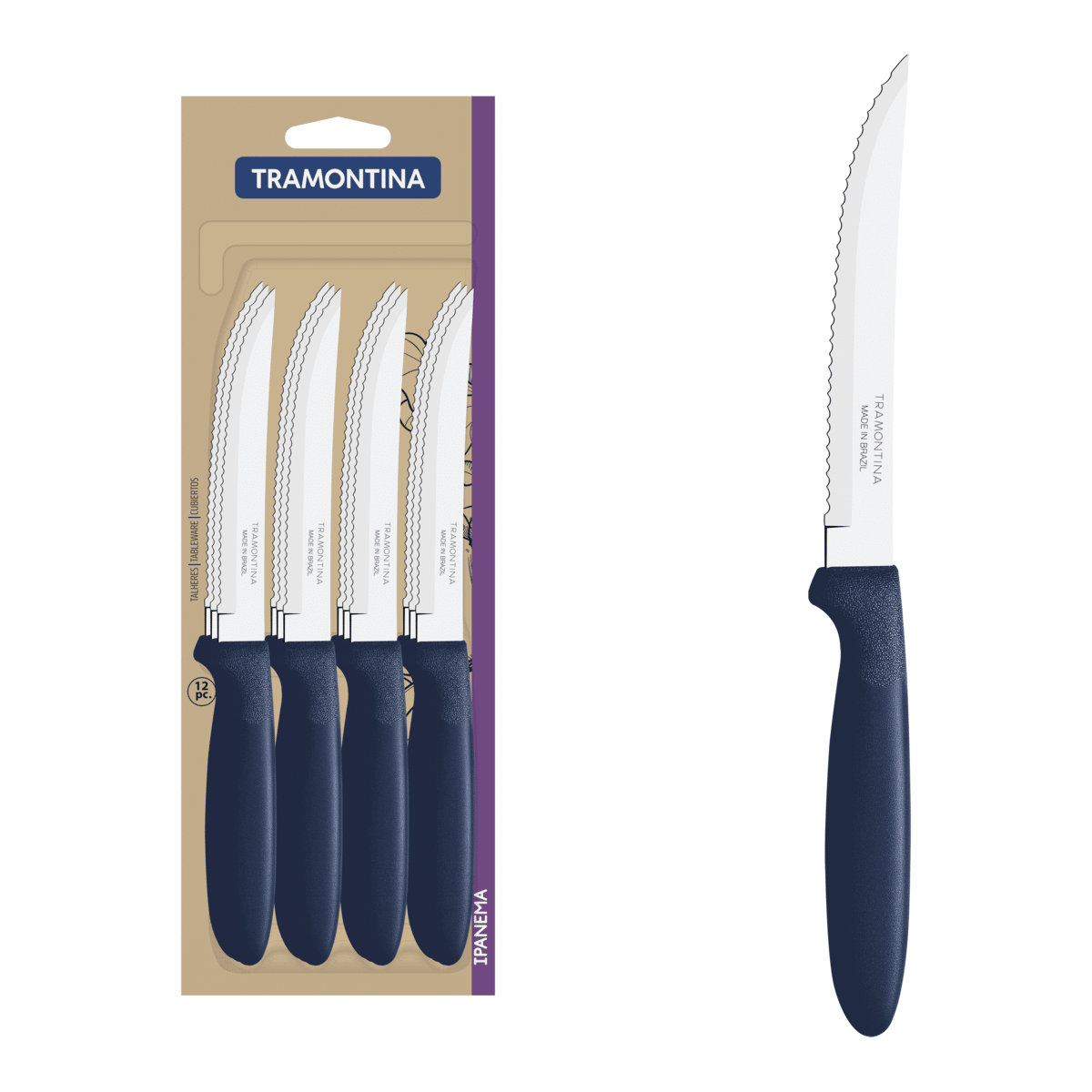لإضافة اللون والأناقة إلى طاولتك ، فإن طقم سكاكين ستيك من الفولاذ المقاوم للصدأ 12 قطعة من Tramontina مع مقابض من البولي بروبيلين الأزرق هو الخيار الأمثل! تتميز السكاكين بشفرات من الفولاذ المقاوم للصدأ عالية المقاومة لضمان قطع مثالي. مقابض البولي بروبلين الزرقاء مريحة للغاية وآمنة للاستخدام وتضيف لمسة ملونة وأنيقة إلى طاولتك. هذه السكاكين سهلة التنظيف وغسالة الصحون. مطبخك يستحق منتجات Tramontina Ipanema!