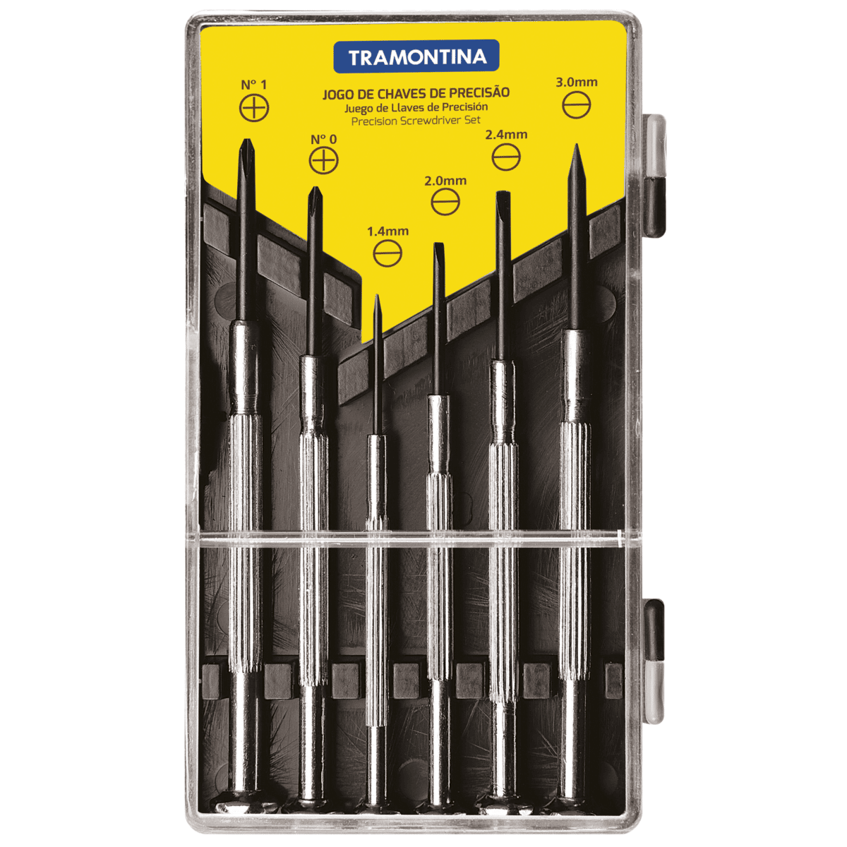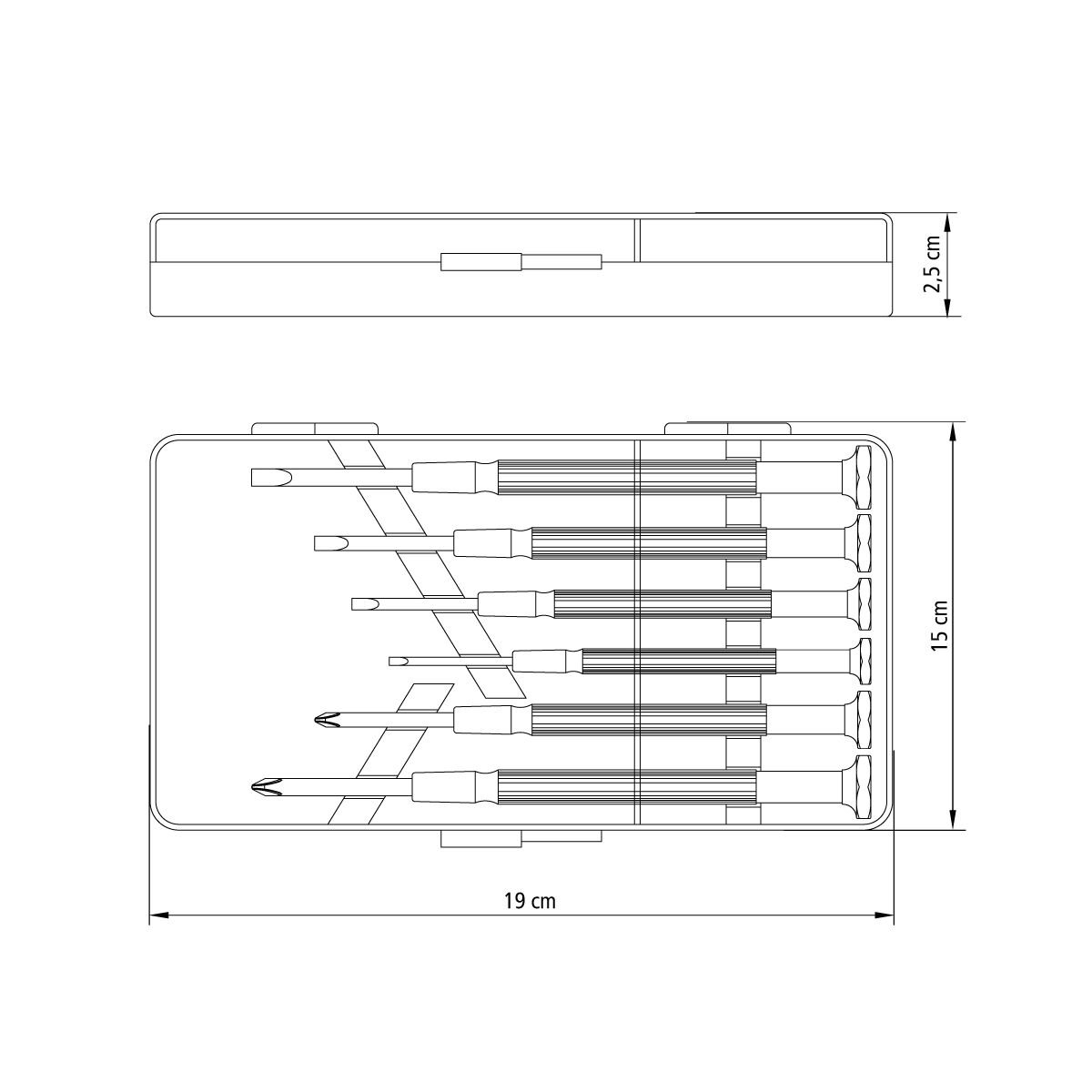 تتضمن المجموعة: 4 مفكات دقيقة ذات رأس مشقوق: 1.4 ، 2.0 ، 2.4 ، 3.0 مم ؛ 2 مفك براغي دقيق طرف مجوف: Nr.0 و Nr.1.