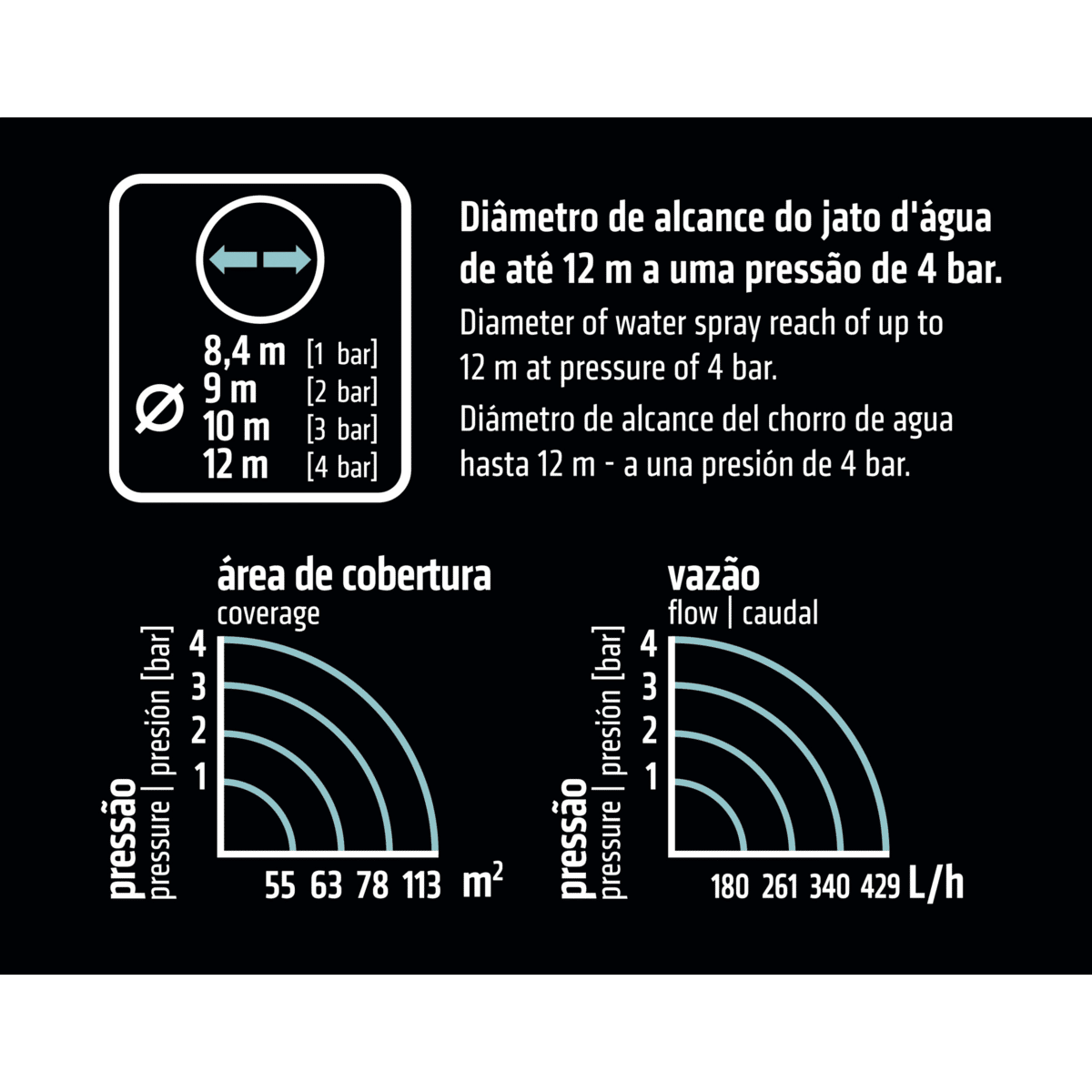 – تغطي مساحة تصل إلى 113 م 2 أو قطر رذاذ الماء يصل إلى 12 م بضغط 4 بار.